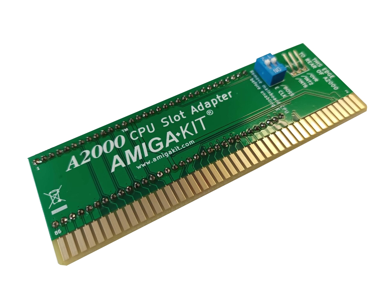 This adapter board plugs into the Commodore-Amiga 2000 CPU slot and then allows connection of a separate CPU board with a 68000 foot print (such as compatible FPGA accelerators for example).