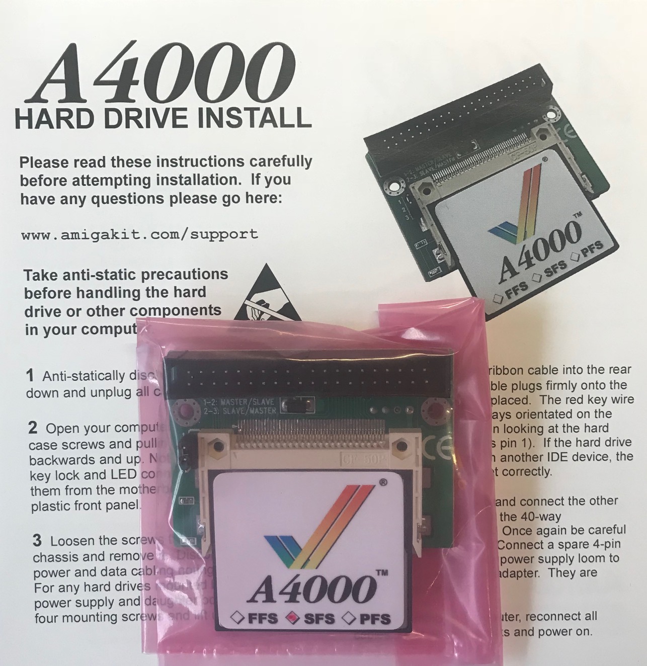 This brand new 4GB CF hard disk drive is ideal for a desktop Amiga A4000™. It is silent, low power and fast alternative to a conventional hard disk drive.