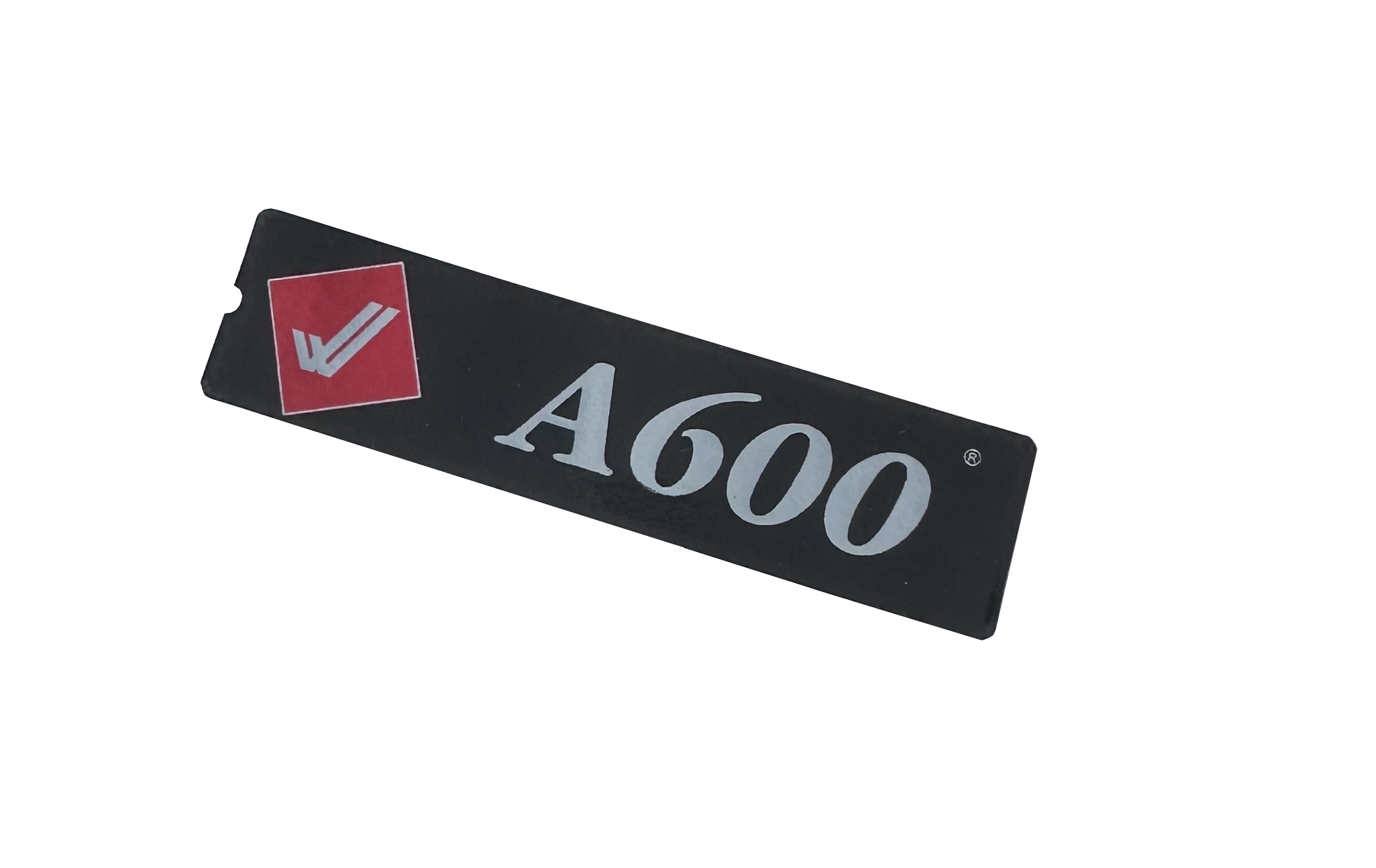 A600 logo has silver metallic appearance. Double check/tick is also silver in colour on a red metallic diamond.