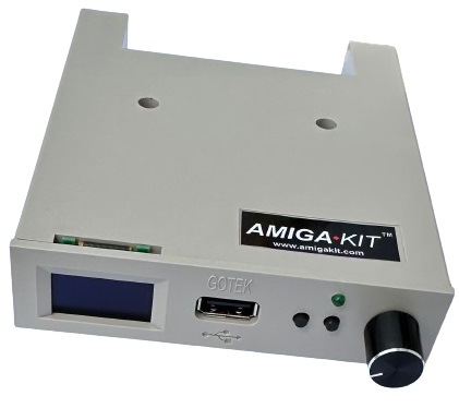 The Gotek floppy drive emulator plugs into the Amiga's 34-pin foppy conenctor and emulates a floppy disk. It accepts a USB flash drive which is connected into the front USB socket. Games and other Amiga disk images can be stored an the optional USB flash drive in Amiga Disk Format (ADF) and then loaded by a menu.