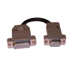 Adapter features 15-pin female plug (PC joystick) to 9-pin female plug (Amiga joystick port).