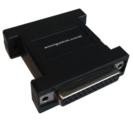 Installation: plug one end of the adapter into the serial port on the rear of the Amiga and then connect a serial cable (male 25-pin) into the adapter. Ensure your Amiga is switched off first before connecting the adapter.