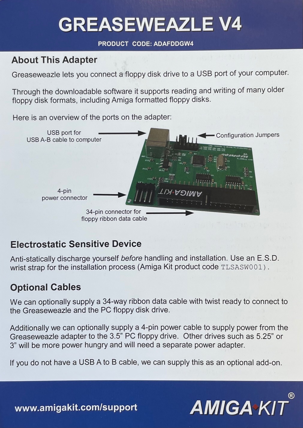 ■   Amiga 34-pin floppy ribbon cable, to communicate with an Amiga floppy drive with a 4-pin power cable. Lengths of 45CM